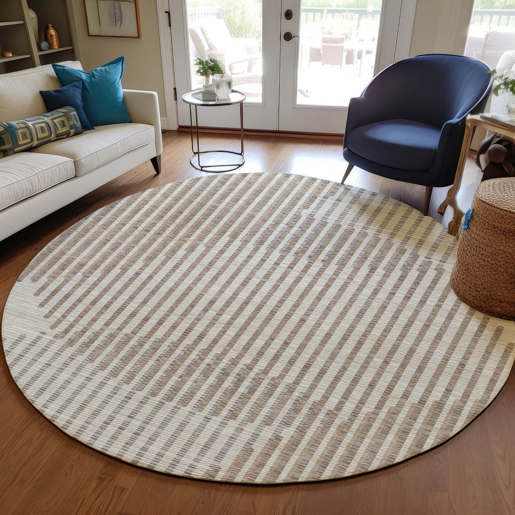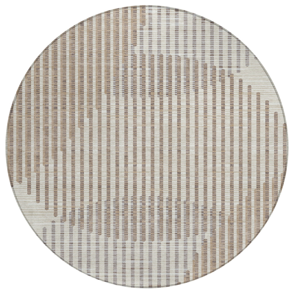 Our stylish area rug showcases an engaging pattern of circles and vertical lines, offering a transparent effect that enhances any room. The transitional design with its circular elements adapts beautifully to both contemporary and classic settings. Engineered for durability, this rug is UV stabilized, features an ultra-thin construction for ease of use, and is machine-washable, ensuring it stands up to the rigors of a busy, pet-friendly home.